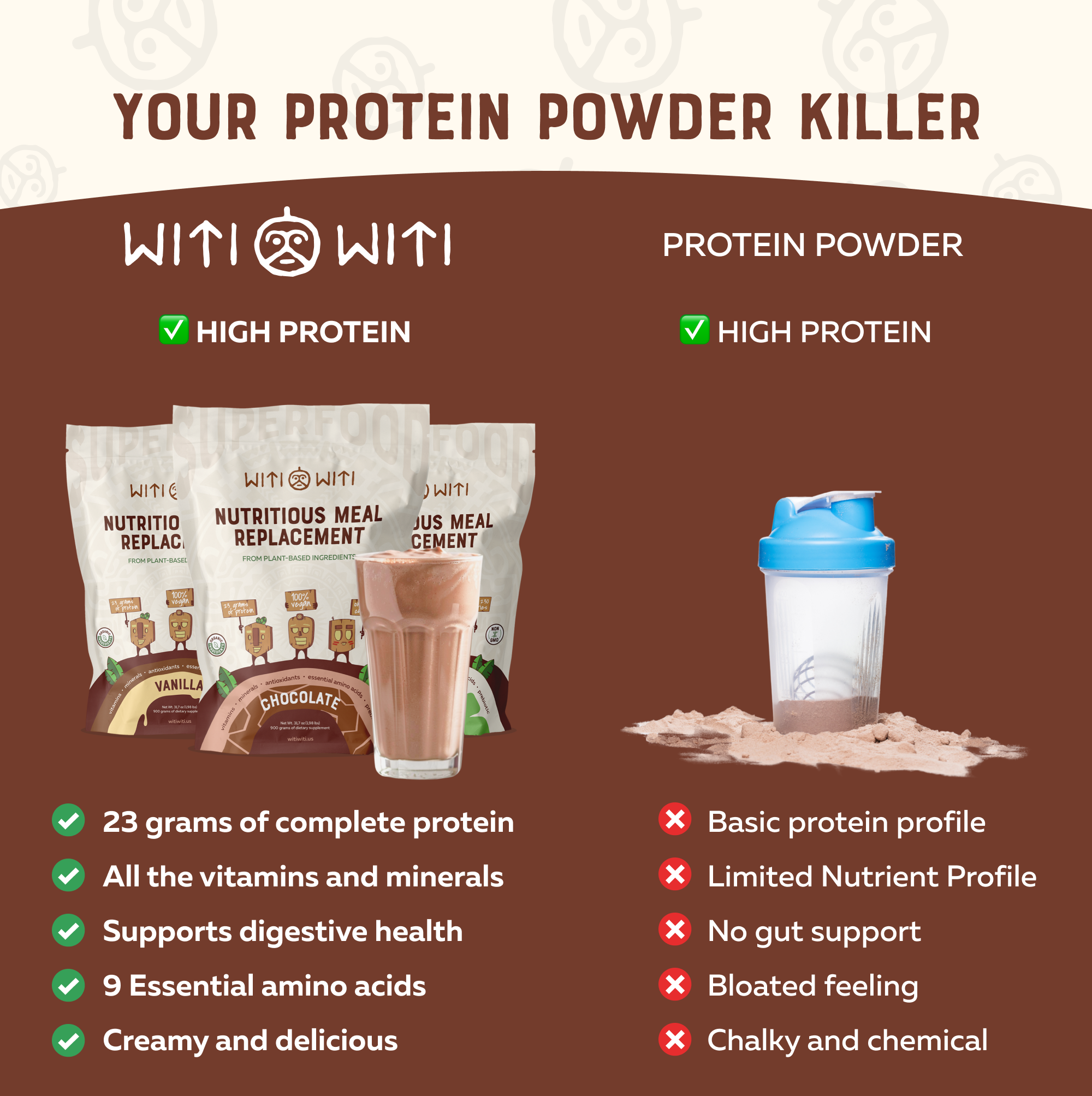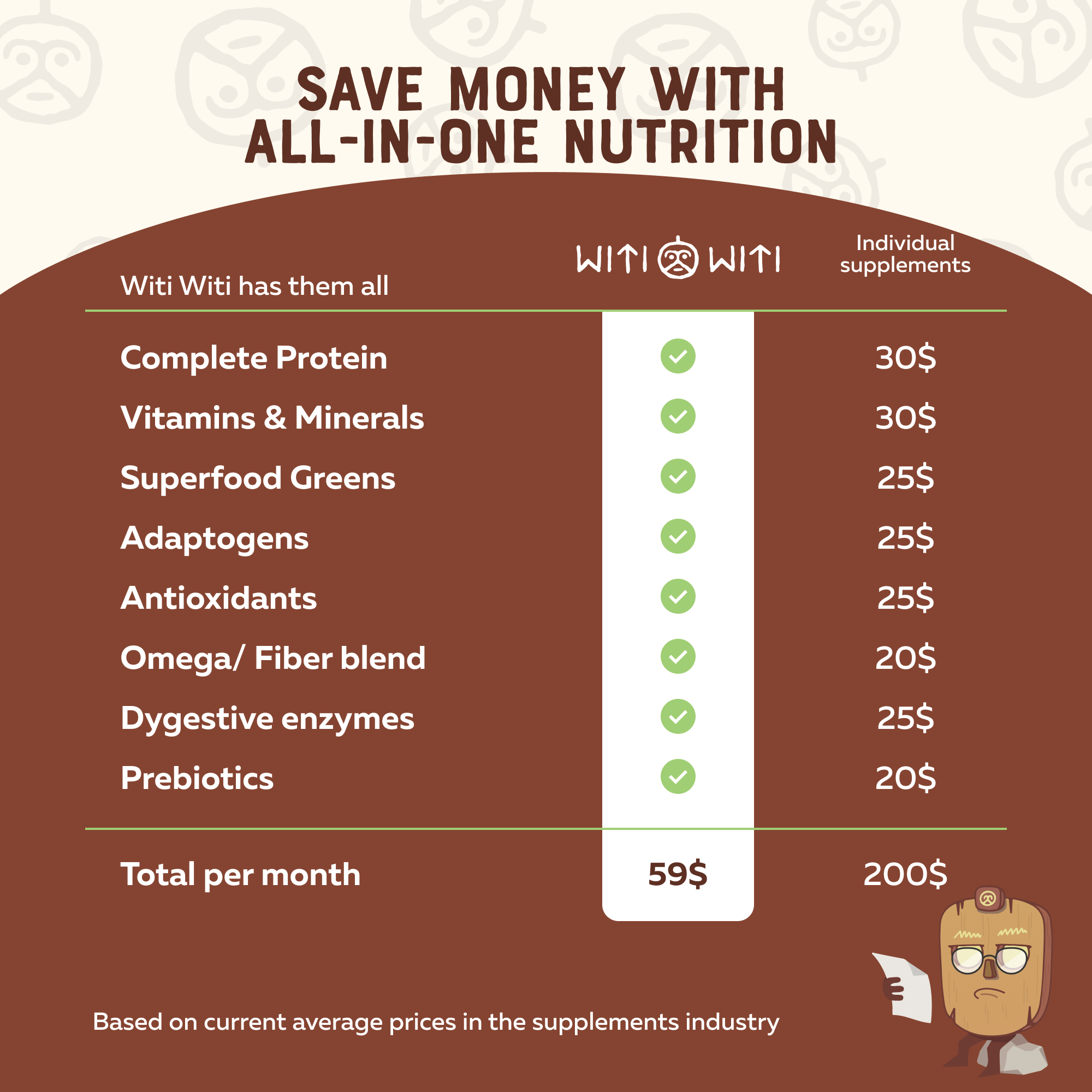 Why pop a handful of pills when you can sip on something creamy and delicious? Witi Witi packs all the essential nutrition, vitamins, and minerals into one tasty shake. Say goodbye to the supplement chaos and hello to convenience with a daily dose of health benefits!